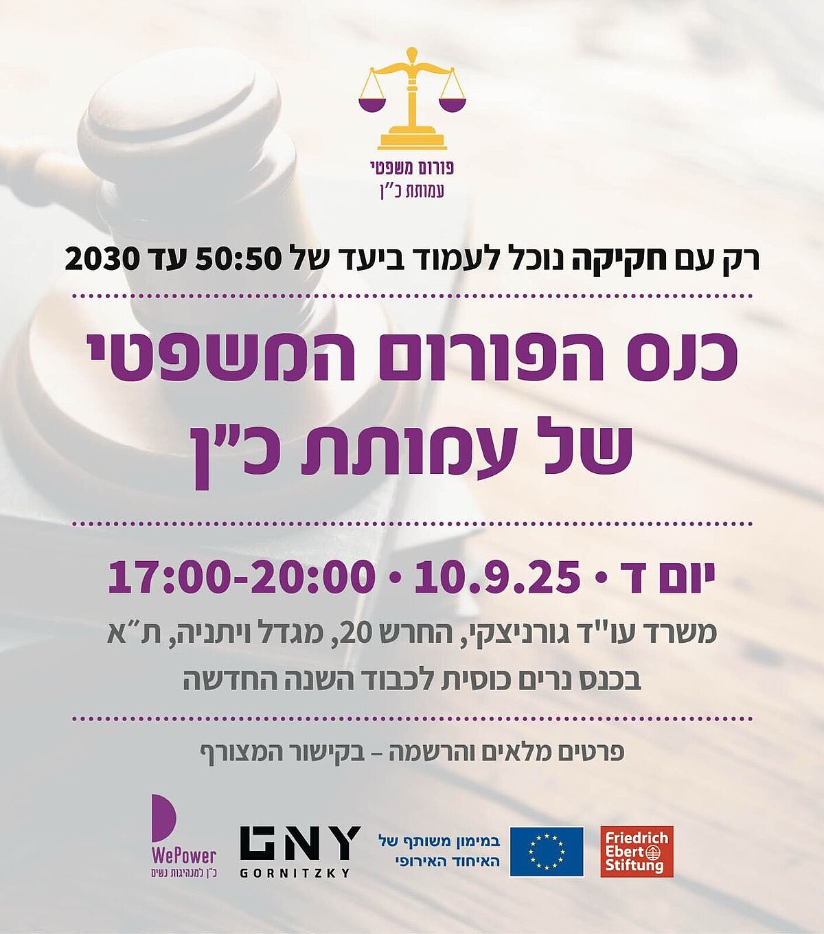 ممثلات من مكتب المحاماة غورنيتسكي، رئيسة الهيئة للنهوض بمكانة المرأة السيدة ميراف شتيرن، رئيسة جمعية "قوة للنساء" د. المحامية أوريت ريشفي، مديرة المنتدى القانوني المحامية عدي ليفي سكوب، ممثلة مؤسسة فريدريخ إيبرت يهوديت ستلماخ، عضوات منتدى "قوة للنساء".